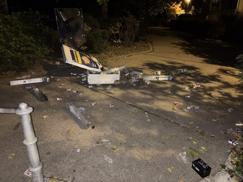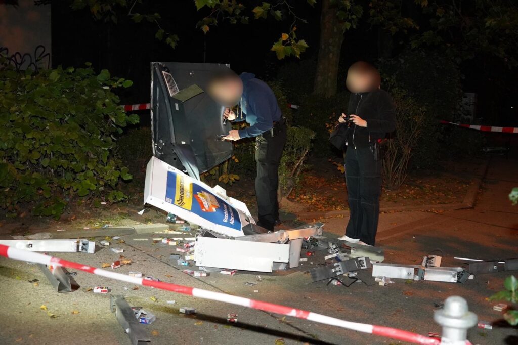 Nach ersten Erkenntnissen sprengten zwei bislang unbekannte Männer den Automaten, um an Bargeld und Zigaretten zu gelangen. Mit ihrer Beute flüchteten sie spurlos in die Dunkelheit. Eine sofort eingeleitete Absuche blieb erfolglos – von den Tätern fehlt bislang jede Spur.