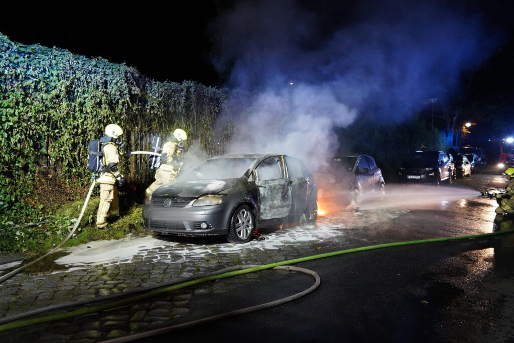 Anwohner hatten gegen Mitternacht die Feuerwehr alarmiert, nachdem sie an einem Wagen ein Feuer entdeckten. Als die Einsatzkräfte eintrafen, griffen die Flammen bereits auf ein zweites Fahrzeug über.