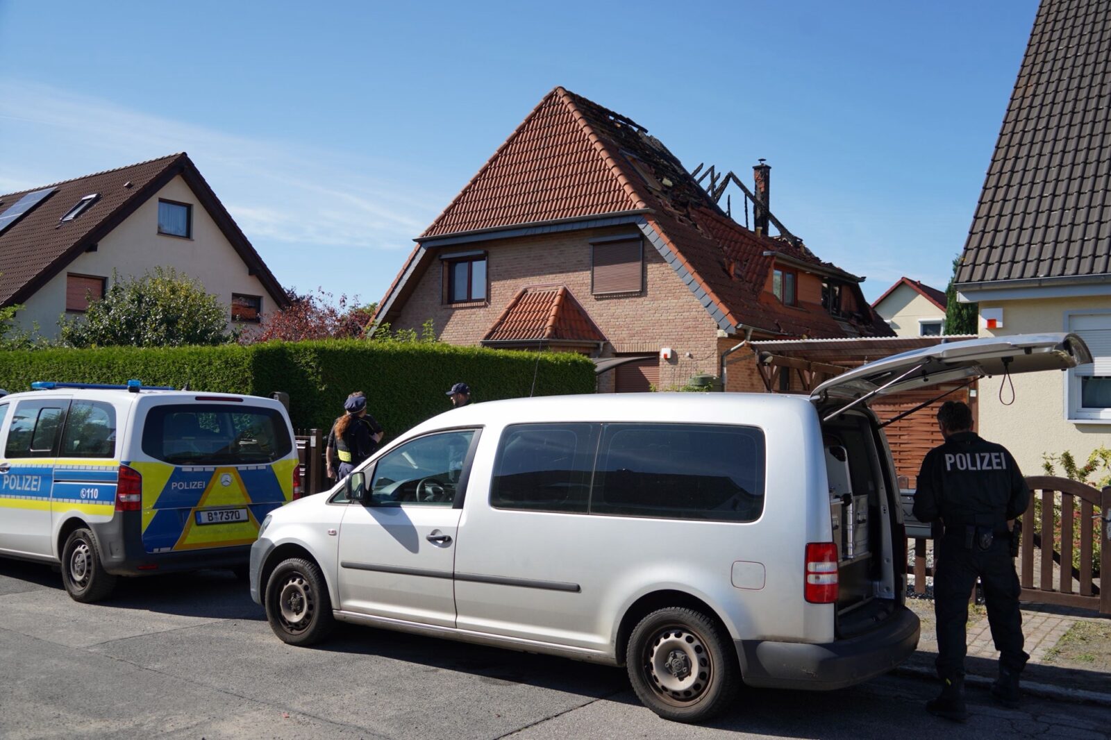 Zuvor brannte gegen 3 Uhr eine Doppelhaushälfte am Hornetweg in Marzahn vollständig aus, zu der Anwohner Polizei und Feuerwehr alarmierten. Die Einsatzkräfte der Feuerwehr fanden im Zuge der Lösch- und Rettungsarbeiten zwei bereits tote, mutmaßlich erwachsene Männer, deren Identität noch nicht zweifelsfrei feststeht. Vier weitere Männer, darunter drei Männer im Alter von 33, 38 und 45 Jahren, konnten sich aus den Flammen retten, wovon zwei so erheblich verletzt waren, dass sie von Rettungskräften zur stationären Behandlung in Krankenhäuser gebracht wurden.