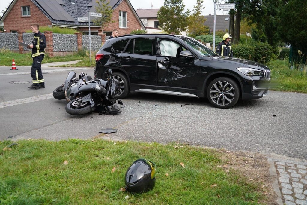 Berlin-Biesdorf – Am heutigen Nachmittag kam es gegen 14:20 Uhr an der Kreuzung Prignitzstraße / Boschpoler Straße zu einem schweren Verkehrsunfall zwischen einem BMW und einer Kawasaki.