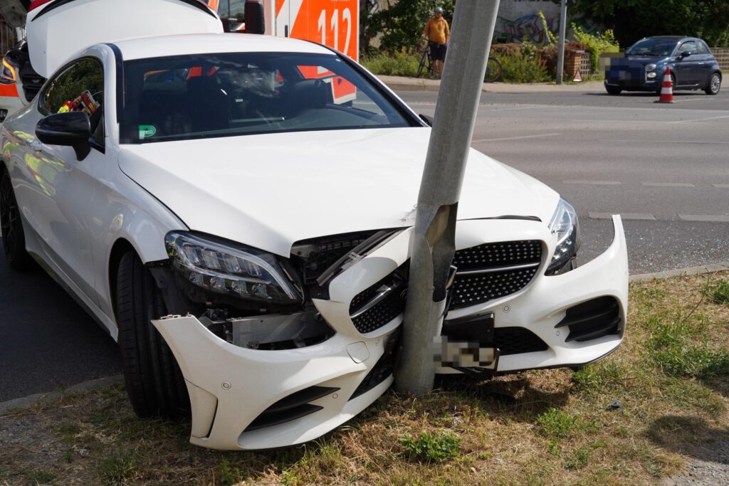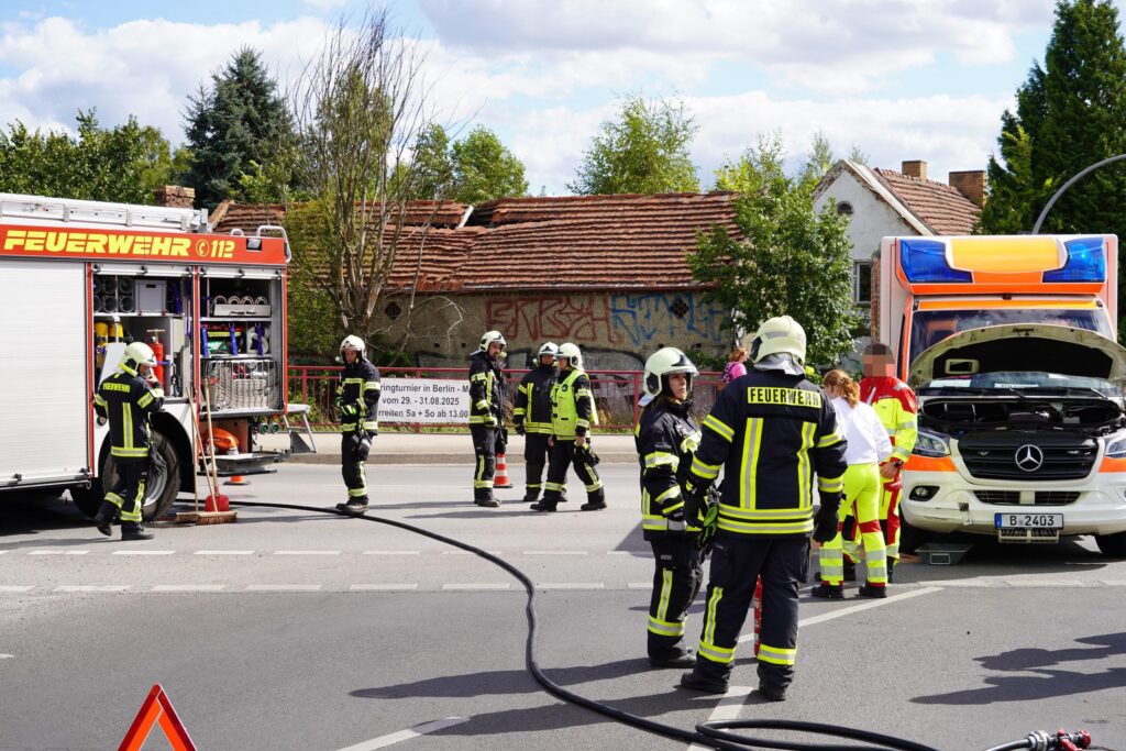 Nach ersten Erkenntnissen stieß der Pkw mit dem Einsatzfahrzeug der Berliner Feuerwehr zusammen und prallte anschließend gegen einen Laternenmast, der durch die Wucht des Aufpralls in Schieflage geriet. Der Mercedes wurde dabei erheblich beschädigt. Glücklicherweise blieb es nach derzeitigen Informationen bei Sachschäden – verletzt wurde niemand.